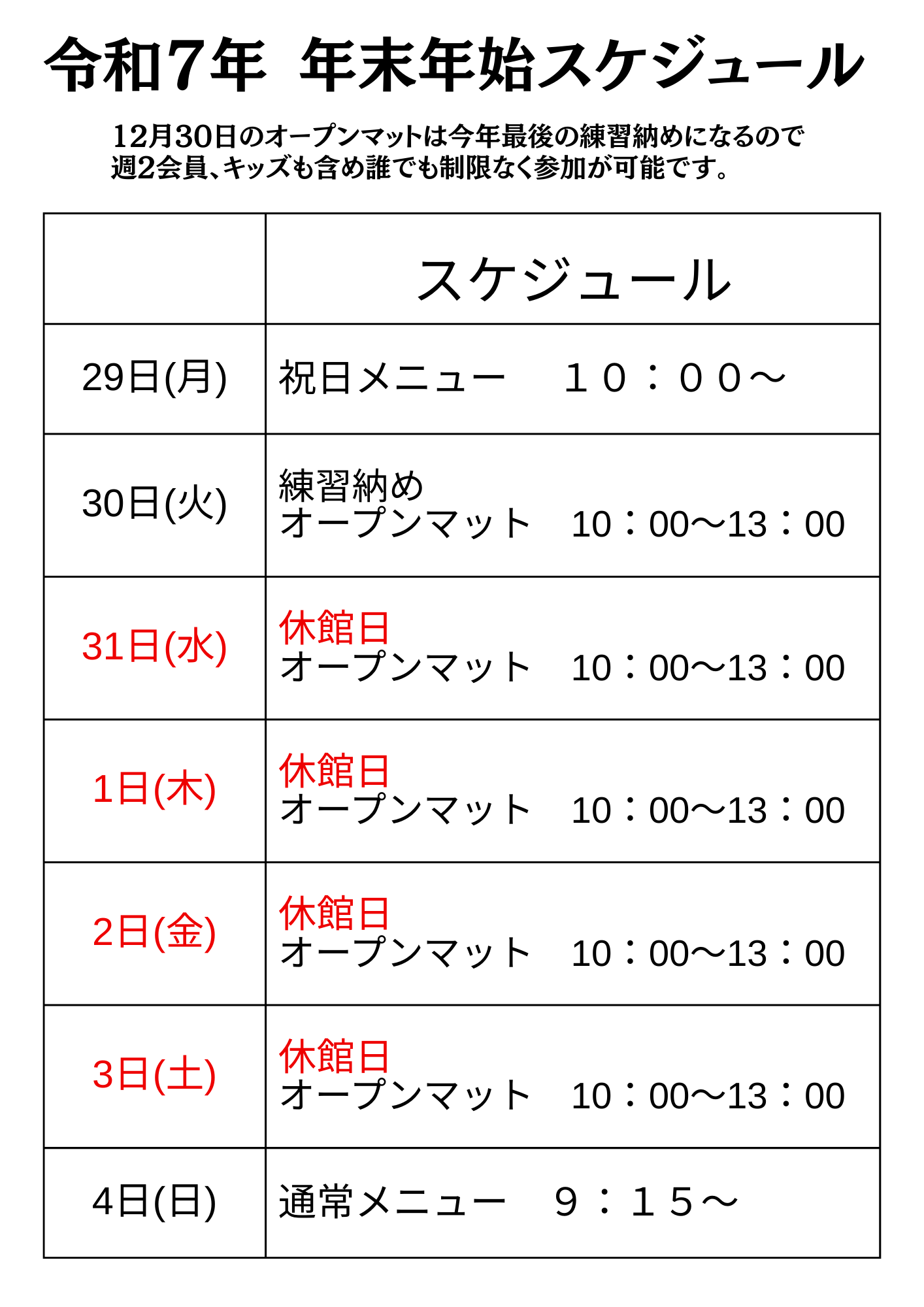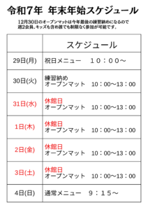 2025-12-27ブログ 年内最後の夜クラスでした サーキットトレーニング 26日金曜日は年内最後の夜クラスでした。 サーキットトレーニングもやりきりました! 明日土曜日はコンペ練習、日曜日は通常通り午前クラスとなります。 29日から年末年始のスケジュールとなるため クラスの体験は1月4日日曜日以降となります。 1月1日のオープンマットはなくなり完全休館日となります。 前の記事へ | ホームへ | 次の記事へ