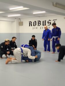 柔術の動きに必要な足回し、足けり、肩ブリッジなどを行います。