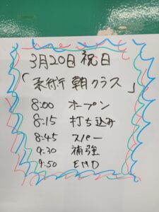 2026-03-19情報 20日祝日特別朝クラス 急遽決定! 3月20日金曜日は祝日です。 通常祝日は10:00より祝日クラスを行っています。 今回は特別に祝日クラスに加えて朝クラスを実施します! 8:00 オープン 8:15 打ち込み 8:45 スパーリング 9:30 補強 9:50 朝クラス終了 10:00 NO-着クラス 11:00 NO-着スパーリング 12:00 フィジカルトレーニング 12:45 終了 前の記事へ | ホームへ |