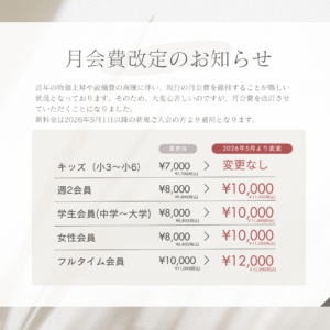 休会会員を含む現会員様につきましては、2027年4月分より新料金へ変更となります。感謝の気持ちも込めて1年間の新料金対象外サービス期間をもうけていますので、たくさん皆様にお通い頂だけるようお待ちしております。
